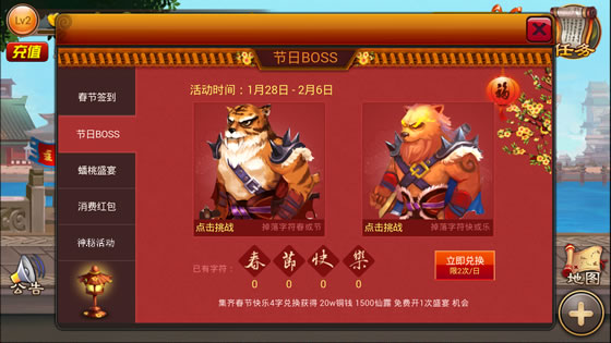 传说,过年放鞭炮贴春年是为了赶走怪兽BOSS“年”。1月28日至2月6日,《囧西游》游戏里也有类似“年”这样的怪兽来骚扰囧友们。囧友们要发挥团结的力量,齐心协力击败“年”BOSS,击败“年”BOSS,将能收集到BOSS身上掉落的字符,字符包含:“春节快乐”四个字,集齐字符每次将可兑换奖20万铜钱、1500仙露。每天的第1次字符兑换,还能额外奖励春节第三个活动——蟠桃盛宴1次开启的机会。