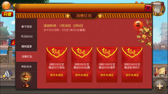 新年到,走家串门送红包,记得也给《囧西游》送点红包。1月28日至2月6日,每日消耗元宝达到一定的数额,将获得相应的奖励。如每天消耗到200元宝,将奖励50万铜钱;每天消耗达到500元宝,可得5000仙露的奖励。