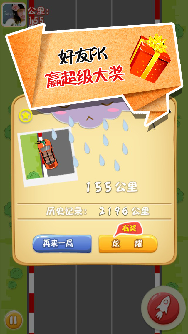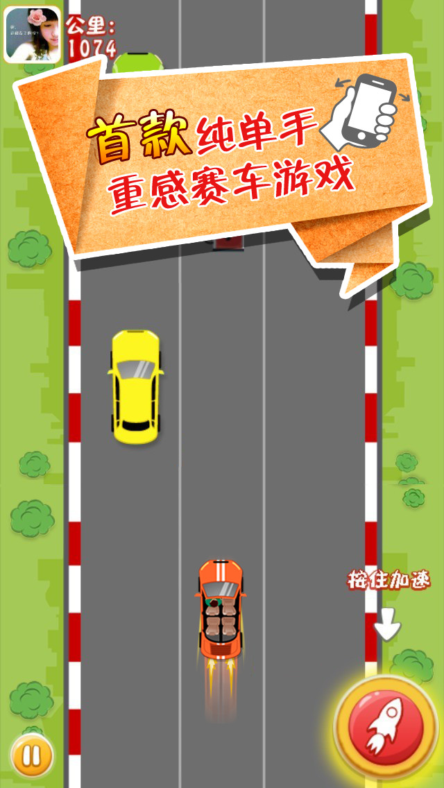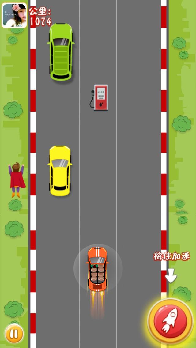 当右下角圆圈火箭按钮闪亮的时候,按住这个按钮可以让赛车加速向前冲刺,如果搭配道具中的无敌卡瞬间就能体验极速的快感。