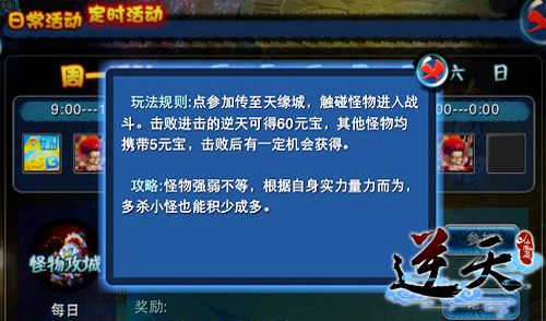 怪物来袭,保卫家园!为了守护天缘城免受海量怪物侵害,奖励每一次的击杀攻城怪物的行为,更有元宝赠送!本次,为了喜迎春节的到来,师姐特别来到怪物攻城活动来犒劳玩家!在1月28日至2月10日这段活动时间内,天缘城会受到逆天妖将率领的大量怪物攻击,除了击杀普通怪物的活动奖励,在活动期间挑战师姐还可以获得更丰厚的新春元宝大礼!