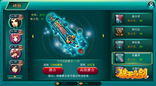 很多社会学家说现在的人浮躁,说啥都口若悬河,可从踩个脚印就能怀孕这事儿来看,咱老祖先们也不是省油的灯,比我们还能掰,没准儿是遗传呢看来。伏羲有伏羲琴,传说“伏羲见凤集于桐,乃象其形”削桐“制以为琴”,流传千古,可是好东西,在《破天之剑》中,它是玩家们提升战力必须修炼的神器之一,可以增加英雄的防御,还可以不断修炼,只是收集起来比较困难,有很多碎片都是要击败BOSS才能得到,所以异常珍贵。