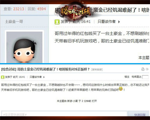 今天小编逛论坛,发现一个ID为“土豪金一哥”的玩家发布一个询问苹果服正版何时开启的贴子,引来大批苹果玩家的支持和安卓玩家的围观。