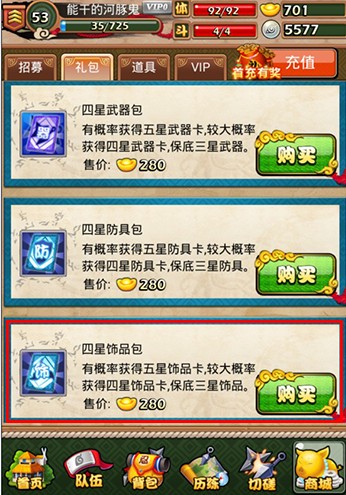 以国战为主打的《火影大人》,每晚的福利也是非R抽取装备的绝佳场所。只要3000功勋,就可以兑换高级装备包,中等概率出五星装备,包括武器、防具、饰品。