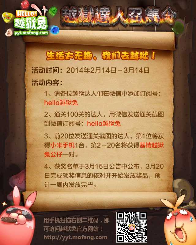 玩《hello!越狱兔》抢小米3手机和超萌兔公仔啦!2月14日-3月14日越狱达人们关注官方公众微信号(hello越狱兔),并且进入游戏完成通关100关,将截图发送至官方微信,就有机会获得小米手机和基情越狱兔公仔,先到先得哦!