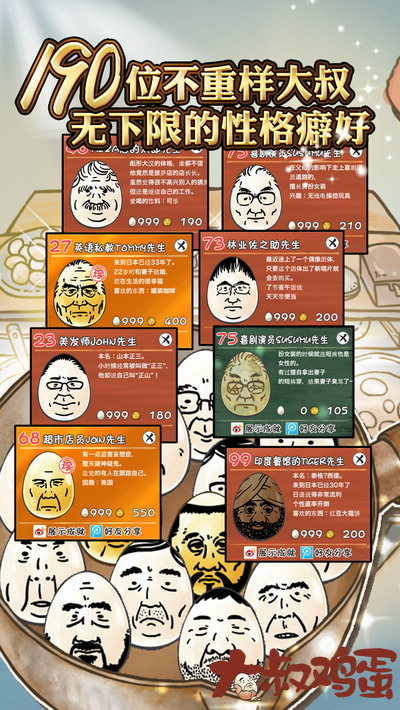 随时随地,不耗流量,男女老少一起煮蛋,收集属于你的大叔吧!2014年度最奇葩手游《大叔鸡蛋》iOS版已火热开放下载体验,下载即送日本原装进口的限量版手机壳哦!