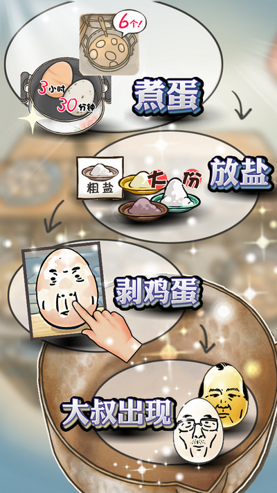 《大叔鸡蛋》的创意非常奇葩,复古的涂鸦画风就让人眼前一亮,玩法也是绝无仅有。玩家需要用不同的锅和盐,花费时间煮熟鸡蛋,手指滑动剥开鸡蛋,出现的却是一张张大叔的脸。《大叔鸡蛋》里面有190位大叔,每位大叔的脸绝不重样,简单涂鸦却神采到位,猥琐、苦逼、邪恶、喜感应有尽有,让人捧腹,集满一锅指定的大叔脸,就可以开启下一个锅了。