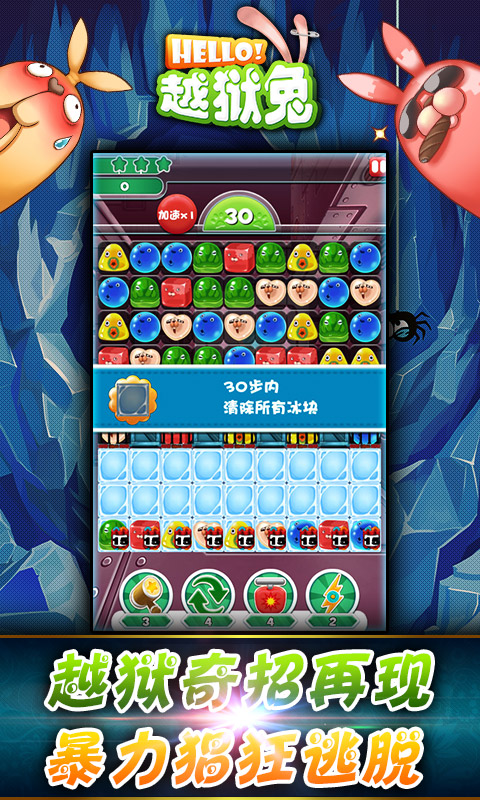 《hello!越狱兔》是由白橘子网络倾力打造的最新手机游戏,游戏以《监狱兔》动画为背景,添加大量新的游戏元素,使其成为策略、冒险、闯关和爆笑剧情为一体全新三消游戏。玩家在回味原剧的同时更要运用各种策略消除各种组障,收集各种道具,帮助两只追求幸福的“基友”兔子越狱成功。