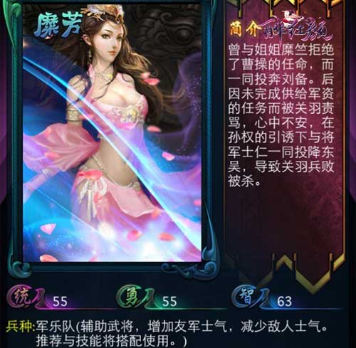古人云“夫战勇气也,一鼓作气,再而衰,三而竭”,作为典型的辅助型兵种,军乐队和战鼓队对士气的提升有着极为重要的作用,在《醉红颜》中同样如此。郭嘉和糜芳两个武将虽然属于不同的阵营但其统帅的兵种却有相似之处,军乐队和战鼓队的作用在于增加友军士气减少敌人士气,从而帮助己方抢占先机,抢先一步发动技能攻击。