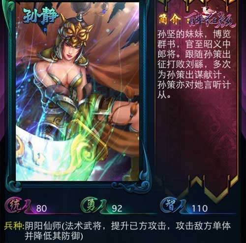 孙静,三国时期孙权的妹妹,此女自幼灵巧聪慧,曾多次为孙策出谋划策,孙策也对她言听计从,官拜昭义中郎将。孙静成名之后并没有选择继续跟随孙权征战而是选择留任家乡,因此很多人对其为人、武技不甚了解。在《醉红颜》中,按职业划分来说孙静属于法术武将的一方,但其麾下兵种阴阳仙师的优势更多的体现在辅助队友与减少敌人防御的方面。阴阳仙师技能发动后可提升己方攻击,攻击敌人单体单位并降低其防御的效果。