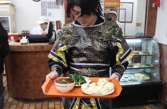 男性COSER打饭并未引发围观,尽管也是六个包子