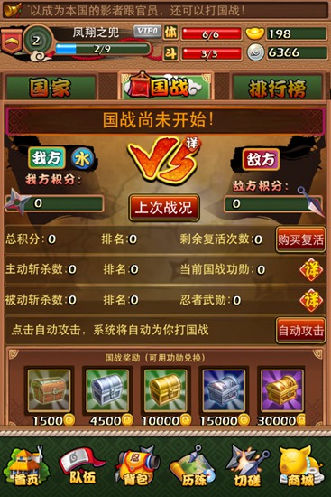 《火影大人》最给力活动,国战天天开启,以下来看看具体玩法。国战是火影大人里互动性比较强的一个环节,每晚19:30准时开启,历时1个小时,战胜国每个队员可以领5000银币,这也是整个团队协力的收获。除了上述的奖励,国战对于玩家个人而言,好处也有很多,最大的就是大量经验,大量的国战功勋,国战功勋可以累积兑换国战下面的各种宝箱,神马5星装备、5星忍者卡应有尽有。