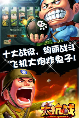 三千虎军直捣日军,新服将开,你想不想化身抗日大元帅,统领千军万马征战抗日沙场。《大抗战》铁血战场全面开战,热血豪迈的军演竞技,激战爽快的军中之王挑战,紧张刺激的血战东京,万人蜂拥的世界BOSS战…,让我们走进那片历史天空,与鬼子战个痛快!