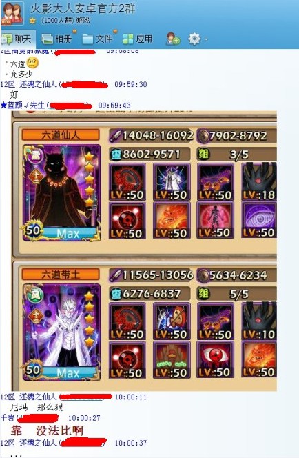 此截图来自《火影大人》QQ群。真正的大神,不需要说话,只需要发自己的阵型就可以秒杀一切。来,大家一起膜拜膜拜!满转12强化满级六道仙人、六道带土、女神纲手、宇智波鼬、千手柱间!全人物五星忍术、五星装备,神一样的存在啊。