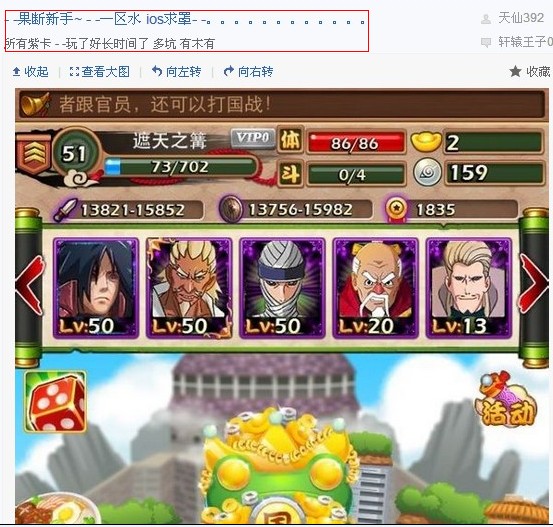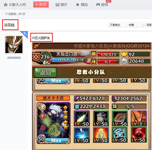 《火影大人》百度贴吧还有一撮别有用心的小伙伴,确实把我们幽默了一把。很多玩家看了可能会很奇怪,这是什么情况?51级?全紫卡?还有斑神?其实这是楼主的小玩笑,具体操作就是在游戏中不升级,单抽免费的万里挑一和千里挑一,长时间累积出来的结果。