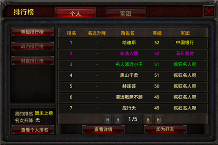 “竞技场”的“连胜排行”和“巅峰对决”里的“战力排行前十”(《封魔》十大高手),这些“王座”可是对大家虚席以待!另外,个人与军团“排行榜”中的等级、战力、财富可也是玩家们角逐的“星光大道”!
