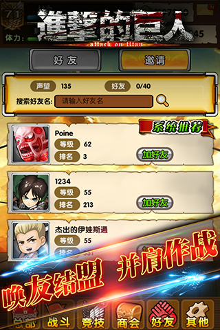 当玩家登陆《进击的巨人》之后,会得到一个专属的邀请码,运用该邀请码邀请好友进入游戏,你和好友都可以领取丰厚的独家道具!随机紫色人物卡牌、精锐征召令牌、经验卡、上万铜币等诱人奖励,将随着你的挑战不断发放,快来体验吧!
