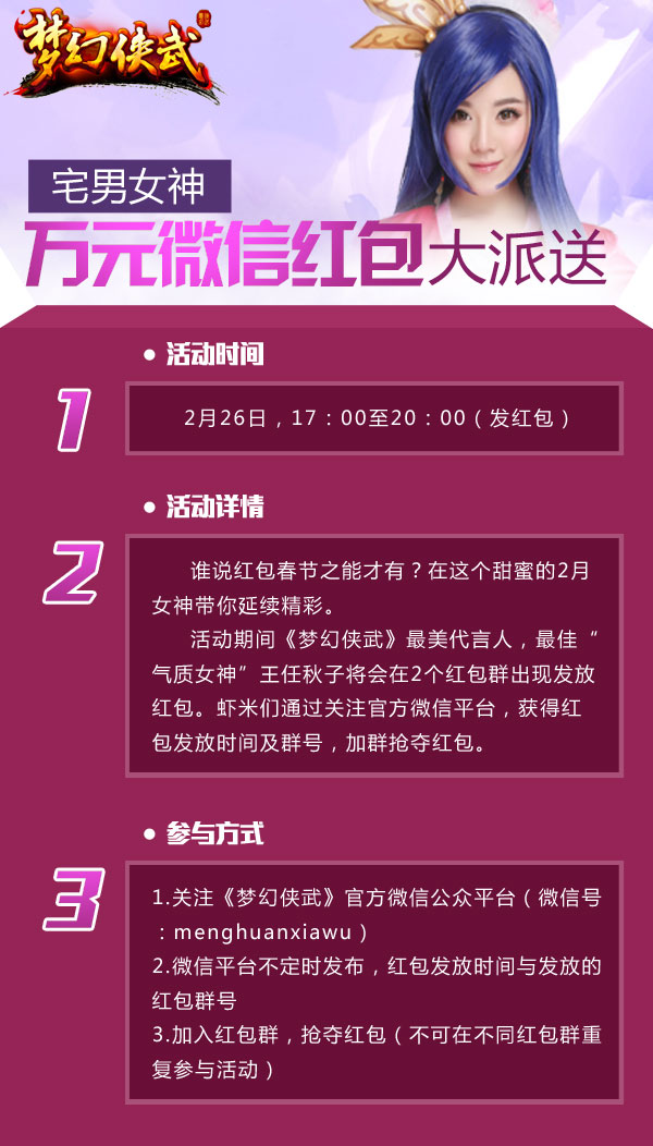 微信派发红包活动会在晚间17:00至20:00开启,届时《梦幻侠武》官方微信会提前发布微信的红包群号,虾米们加入微群,抢夺红包即可。小编在这里要提醒大家,不能太贪心,每个人只可加入一个群领取一次哦~