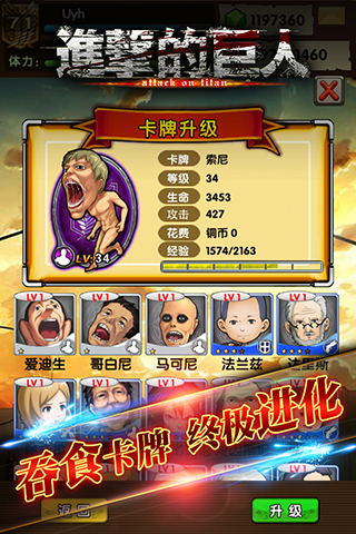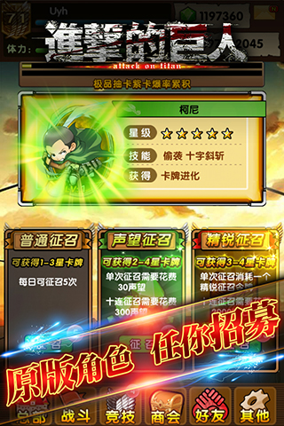 《进击的巨人》在终于原著的基础上完美的还原了动漫剧情,更通过技能效果、打击声效等内容与原著动漫进行水乳相融,使玩家真实再现动漫中的战斗激情!Q版精致的炫酷卡牌,让玩家可以选择艾伦、三笠、爱尔敏等喜爱的动漫人物,更可以成为巨人,精美的卡牌将完美还原动漫角色!游戏中还有无限量吞食卡牌的终极养成,不仅提升作战水平,其独具的卡牌隐性个性值也随之变化,将战斗属性终极进化!