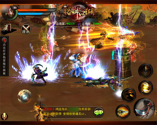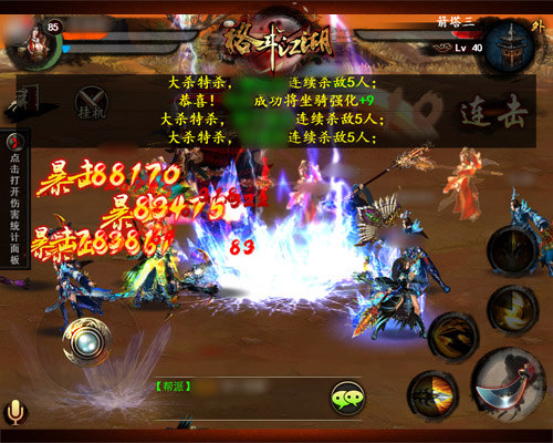 帮派争霸作为《格斗江湖》推出的第一个多人大型PVP玩法,支持40VS40的手动战斗,在手游中是首屈一指的。在战场之上更是激情万分,多人对撸,全屏技能特效带来的震撼效果可不是刷副本能比的。并且,连续击杀敌人,还会有“大杀特杀”、“无人能挡”等系统广播,想想就感觉热血沸腾,有木有?