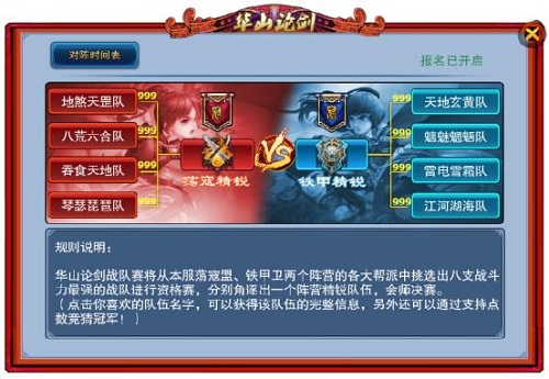 “华山论剑战队赛报名现已开启,淬火四溅,战歌六扬,剑指八荒!绝世战队等你加入!共战天下群雄!”当侠士们看到这热血沸腾的口号出现在眼前时,就预示着《神雕侠侣》“华山论剑”战队赛已经开启了。战队赛采取阵营对抗模式,每个阵营的侠士们都可以集结自己同帮会的强力队友,参与到这场盛事里来,经过激烈战斗决出王者。