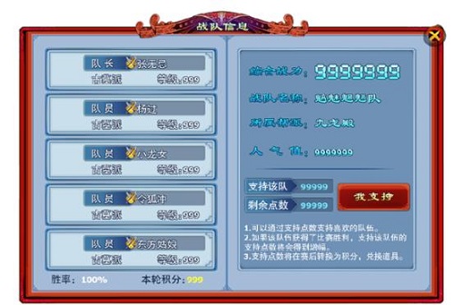 在《神雕侠侣》战队赛八强选拔出现后,侠士们还可以通过对阵图看到每个队伍的详细资料。还可以把自己的“支持点数”投给自己看好的队伍,如果这支队伍成为冠军,支持点数将会获得加成。你的每一点支持点数都是该队伍人气值的直接体现,系统将会在战队赛结算总评选出人气值最高的队伍,该队伍可以去战队军需官处领取【人气王大奖】,这可是粉丝们给这支队伍的支持呢!所以说出门还是要靠朋友啊!人缘好的战队优势大大的呢!而侠士们通过竞猜冠军获得的积分还可以购买"五绝大礼包”、“神兽精魄”、“高级饰品图纸”、“阵法元素包”等稀有物品。