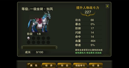 当玩家达到28级之后,就能通过NPC接取任务获得坐骑。获得坐骑后,通过坐骑按钮,就能进入坐骑界面,查看你的坐骑并进行相应的操作。玩家点击地图,任务,开始自动寻路时可以自动上马,也可以在需要骑马的时候通过上马按钮主动上马,而不用再跑去去任务点完成任务了。