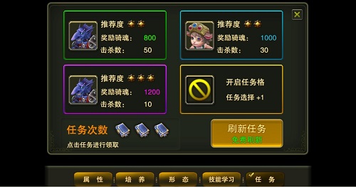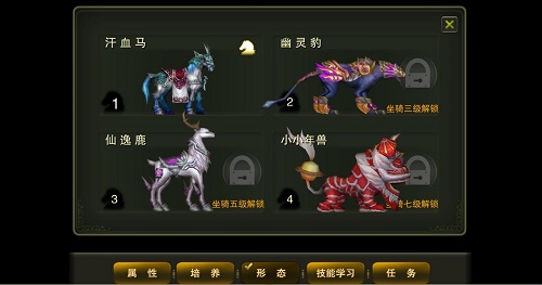 有了新的坐骑,还将会有新的坐骑玩法,玩家每日可以完成3次坐骑的日常任务,能够完成的任务次数以卷轴的形式显示在界面上。坐骑分为不同 的星级和不同的形态,苍逸鹿、汗血马、年兽、幽灵豹等,不同形态的坐骑属性也不相同,想要获得更好的属性和你喜欢的坐骑形态,还需要多多努力进行升级。