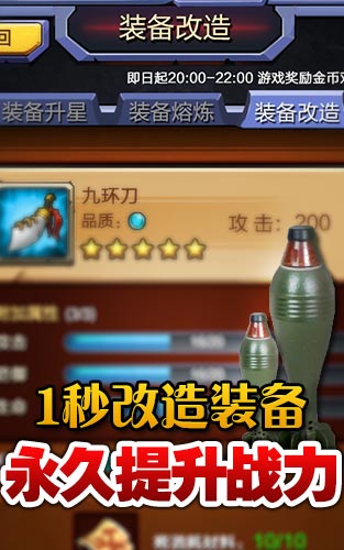 戮日刀饮血渐锋,马克沁重机枪枪火喷发,激情抗战时代怎么能够缺乏强大的火力支援。《大抗战》装备改造新功能以终身提高装备属性为服务宗旨,全面激发装备隐藏属性,焕发全新灭日战力。辅以火箭炮支援、核弹打击、战术导弹、勇气战旗等独特战术技能,痛快杀鬼子体验全面提升。
