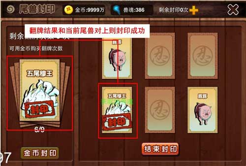相比漫画中单纯提高封印者的能力,《忍者Q传》中的尾兽功能性更为丰富。主角等级达到50级后,尾兽封印系统解锁开启。通过尾兽封印,每名角色每天拥有两次封印机会,每次封印都会经历从一尾到九尾的封印流程,在封印过程中有9次翻牌次数。在右边翻牌区域中翻出当前封印尾兽一致的卡牌,视为封印成功。通过封印尾兽,可以获得兽魂、阅历、银两、声望和金币奖励。其中兽魂是尾兽封印系统的特有资源,消耗兽魂可以提升主角和伙伴的生命值,让你真正化身成为“人柱力”!