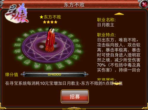 众所周知,《寻侠OL》中的家将的分为历练、声望和星级3类家将,再细分全技能、物攻、法攻3种类型,但神将却不属于其中任何一种。在游戏中,玩家在活动期间每成功消费一定数量的元宝就可以增加对应神将的一点缘分值,缘分值达到4000后即可将东方不败招募成功,且每一位玩家只能招募一次。值得注意的是,该活动中招募获得的家将资质将会随机生成,因此虽然每一个玩家招募到的东方不败资质都是优秀及以上的品质,但具体的各项属性却不尽相同。