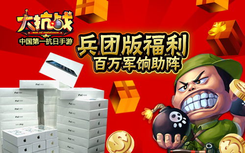 《大抗战》兵团版重磅活动来袭,三大顶级福利活动发放新版开门红包。“向安倍示威”土豪金5S、充电宝分分钟可获,“组建百团杀鬼子”588元金将礼包、公会入驻礼包、苹果5S等豪礼下发,“签名截图转发”转出ipad mini2、话费充值卡等多样好礼。这么多的福利活动,你不心动吗?