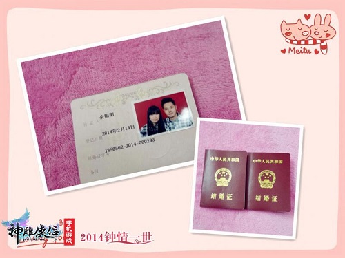 2014年2月14日《神雕侠侣》情侣月活动开启,与此同时,《神雕侠侣》手游玩家陽太太与自己心爱的妹子走入了婚姻的殿堂,这是一个巧合,更是一段缘分。简单的两个红本本,却承载着两个人幸福的重量。单调的证件照,却掩盖不了新婚夫妇发自内心的迷人微笑。《神雕侠侣》在此恭贺这对新人百年好合,幸福美满。