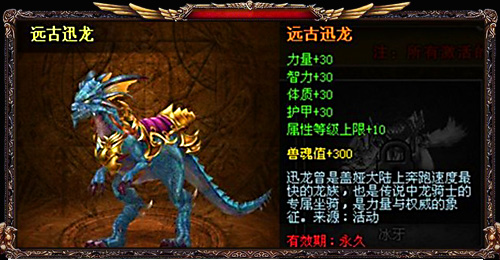 玩家在使用远古迅龙卡后,将能获得力量+30、智力+30、体质+30、护甲+30、属性等级上限+10、兽魂值+300的多种属性地提升!让你瞬间提升战斗力,轻松斩杀巨龙,称霸《新神曲》!