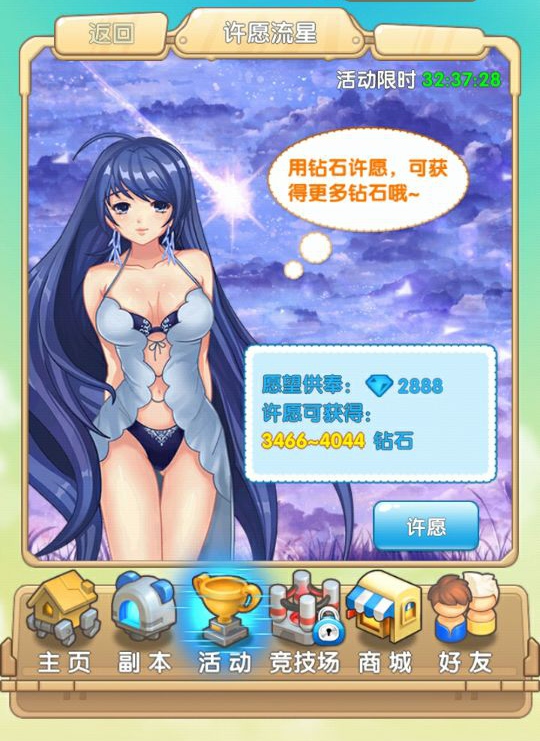 活动期间,在许愿流星活动中,用钻石许愿,可以获得更多的钻石喔~!每个人的许愿次数有限,快来参与吧!