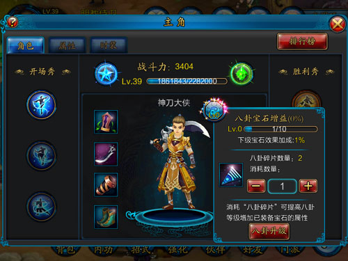 当角色达到35级,点击“头像”打开主角界面即可看到八卦图的图标。八卦图可以通过喂养八卦碎片提升等级,每次提升八卦图等级都能获得一个八卦图增益,对宝石的属性效果进行增幅。