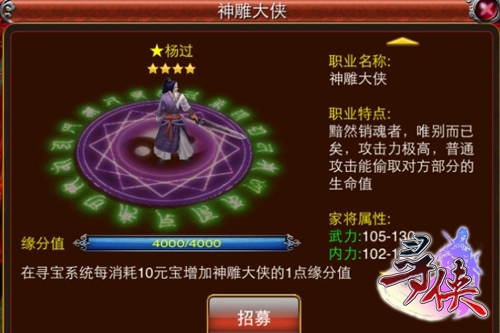想要招募杨过,可不像闯关征服那般简单,像杨过这种堪称神级的侠客,只有和他有缘之人才能得到其辅助。你可以在寻宝中找到杨过,但需要消耗一定元宝来获得缘分值,当缘分值达到规定数值时,杨过就会被激活,加入到你的队伍中为你战斗!