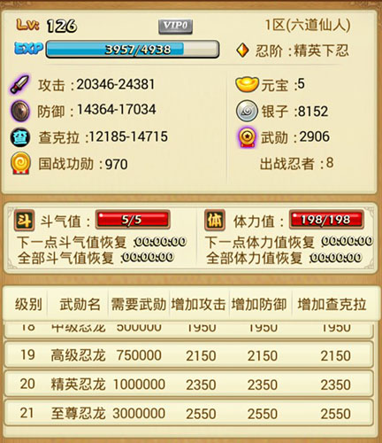 除了新版的国王祭坛能够简单的增加全体战力,《火影大人》本身自带的武勋级别也能做到。玩家可以通过获得武勋来得到相应的武勋级别,点击首页中玩家自己的名字,就可以查看自己的详细状况,其中最下方就有显示不同级别武勋等级增加的攻击力、防御力和查克拉,至尊忍龙相当于增加一个5星忍者的战力哦。武勋可以通过切磋、界碑战等多种方式获得。