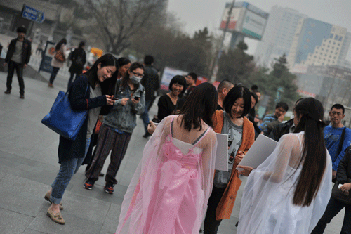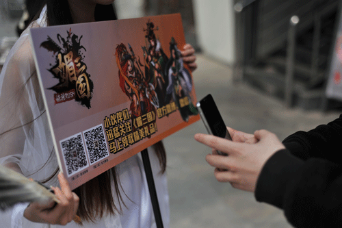 昨日上午的中关村,两名身着古代华服的古典美女现身街头,引起大量路人围观。从图片中可以看出,两位面容姣好的coser手持《媚三国》宣传板在街头徘徊,不时有路人上前合影互动。据悉只要扫描二维码关注《媚三国》官方微信并转发合影,即可获得美女当场印上唇印的台历一本。