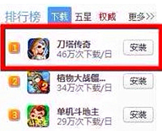 《刀塔传奇》在360平台上线后,凭借单日46万的下载纪录在上线第三日就雄踞下载榜第一,次日表现再创新高,创造了360平台上手机网游的记录。同时,《刀塔传奇》还取得了“卡牌游戏单日注册最高”、“首日PCU最高”、“社区玩家活跃度第一”、“首日充值用户最多”等多个360之最。结合91、多酷、豌豆荚、小米、UC等渠道前三日发行数据,《刀塔传奇》累计下载已轻松过200W。
