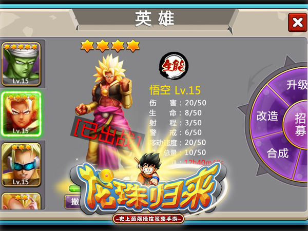 通过自己基地内的建筑“赛亚人飞船”可以对英雄进行招募、出战、治愈、改造等各项操作,游戏中后期将解锁更多可招募的英雄,而且都可以进行培养升级。想想一个超级赛亚人的战斗力就已经能毁灭N个地球,如果能招募到一大群超级赛亚人,还愁不能称霸全服么?