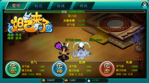 那既然咱这灵气这么好使,肯定有朋友就要问了,这灵气搁哪儿弄去啊?恩,不要着急,各位观众朋友们只要现在打进热线——哦不对是各位大官人只要现在进入妲己姑娘的闺房,进行修灵就可以啦!修灵包括化气、化神、化虚三大模式,任意点击一个都可以立刻修炼灵气,而且不用等待马上获得,是不是很爽呢!?这么爽那么就请立即愉快的加入我们吧!