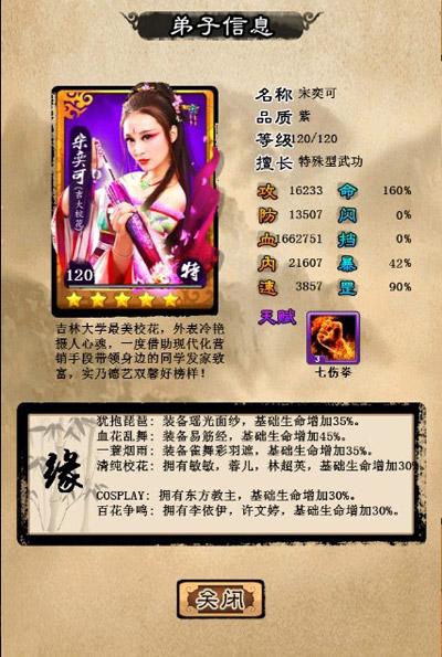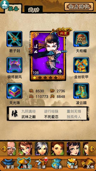 玩过LOL的朋友都知道,游戏里是有推荐出装的,虽然老手都不按照那个购买,但是对于新手来说很有用户,1.10的《霸气江湖》在人物界面点选武功的时候会提示大家那几个是缘分所需,哪几个是推荐使用的,省的小白们外功卡牌使用内功的技能。