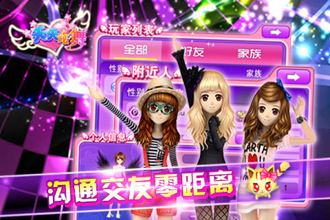 与传统的舞蹈类游戏不同,《天天炫舞》针对玩家交友互动下了不少功夫。游戏中的好友搜索功能拥有强大的实时AI,可以让玩家在享受舞蹈的同时亦能轻松找到附近同时在玩乃至对于服装、音乐等内容有相同品味的舞友。
