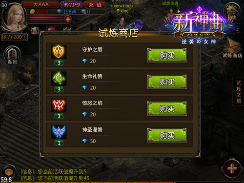 当玩家等级达到46级后,便可参与试炼之塔副本。每位玩家每日只有一次进入副本的机会,因此需格外珍惜。在挑战副本的过程中,玩家可使用4种不同buff,分别为守护之盾3次:减伤90%;生命礼赞3次:回血50%;狂暴3次:增加攻击200%;神圣涅槃1次,死亡的角色恢复生命初始状态,优先对自己使用,也可随机复活队友。