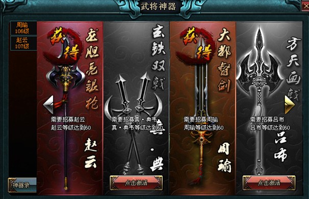每一柄神器都和武将息息相关。熟悉三国历史的你应该对那些传说中的神器有着相当的了解。吕布的方天画戟、关羽的青龙偃月刀、张飞的丈八蛇矛、周瑜的大都督剑、孙悟空的如意金箍棒……都随着神器的主人在历史上留下赫赫威名。