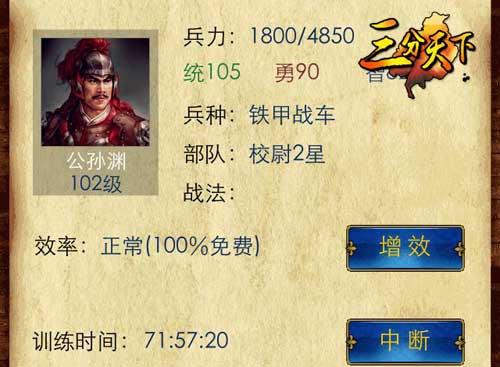 公孙渊,三国时期盘踞东北的一员悍将,曾因斩了吴国的使者献给魏国被封为扬烈将军、辽东太守,后自立为燕王建号绍汉,最终被司马懿带兵击败。在《三分天下》中,公孙渊率领的铁甲战车是游戏中少见的机动兵种之一,该兵种不仅继承了传统战车防御极高的优点,还拥有极高的爆发力和攻击力,在对战时可同时攻击敌方两个部队,是推图作战的首选兵种。