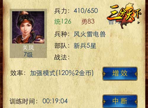 关凤,一代战神关羽之女,此女自幼喜武好斗、性格豪爽,喜欢结交江湖义士,是名副其实的女中豪杰。在游戏中,女神关凤统帅的并不是战争中常见的常规兵种,而是世俗中极为少见的风火雷电兽,此兽可以视为火牛阵的加强版,不仅拥有极强的防御能力,而且进可攻退可守,可以同时给敌方单体及其周围的敌人造成高额的伤害。