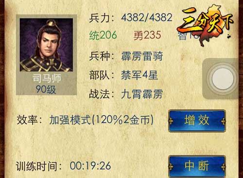 历史当中的司马师沉着坚强,雄才大略,与夏侯玄、何晏齐名。其在掌权后不仅制定了选拔官吏的法规,还命百官推荐贤才,整顿纲纪,朝野肃然。在《三分天下》中,司马师虽然没有历史中那样的雄才大略,但也是诸位主公不可或缺的强力武将之一。其统领的专属战部霹雳雷骑拥有极为强大的战力,其专属战技九霄霹雳是最新的全面战法,可以同时给敌人造成战法伤害和物理伤害,并有极高的概率使敌人进入逃兵状态,是两军对阵时打破僵局的最佳选择。