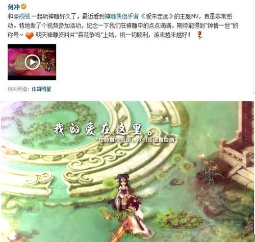 “我一生一世的眷恋,这部神雕MV送给,我的爱人。”奥运会跳水冠军何冲也是《神雕侠侣》手游的爱好者,他在微博上发布了自己献给女友的感人视频,视频中绒小乖和冲小怪一路相随,共游神雕,简简单单的爱情,却蕴含着莫大的幸福,在《神雕侠侣》里,他们延续着属于他们的爱情。“钟情一世”是多么美好的愿望,愿世间有情人皆能终成眷属。