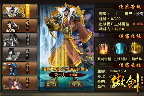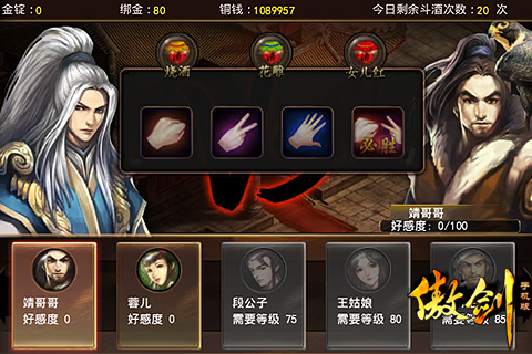 群侠是《傲剑》的独特系统,玩家可以再斗酒中获取更加极品的侠客协助您作战,花酒将消耗10000铜币增加10点好感度、花雕将消耗20金锭(绑金)增加25点好感度、女儿红将消耗100金锭(绑金)增加100点好感度,选择必胜将消耗额外对应的金锭(绑金),并且带有侠侣情节哦,例如:杨过与小龙女就在其中,获得更多的侠客将提供给您更完美的属性加成!!!